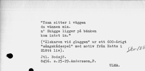 //// "Yxan sitter i väggen du vännen min. nf Skägge ligger på bänken kom intet in." //// ("Älskaren vid gluggen" ur ett 600-årigt "sångskådespel" med motiv från Hatts i v , S18tt liv). //// Jtl. Bodsjö. //// 8456. s.25-29*Andersson,P. //// ULMA. ////
