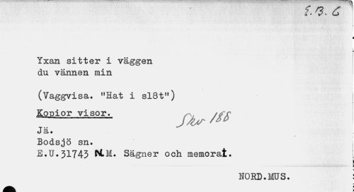 //// 2. 6 //// i //// i i //// ¦ //// Yxan sitter i väggen du vännen min //// ! //// (Vaggvisa. "Hat i sl8t") //// Kopior visor. , ^ /// //// Jä. //// Bodsjö sn. //// E.U.31743 N.M. Sägner och memorat. //// i //// i //// NORD.MUS. i //// m //// - P ////
