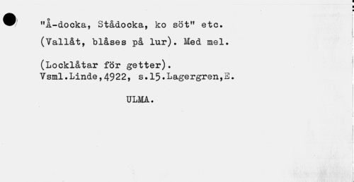 //// k //// "Å-docka, Stådocka, ko söt" etc. (Vallåt, blåse //// s på lur). Med mel. (Locklåtar för getter). //// Vsml.Linde,4922, s.15•Lagergren,E. 1 //// ULMÅ. //// . i //// i //// > //// t //// ¦ '... . '..v'•. //// \ //// i I ////