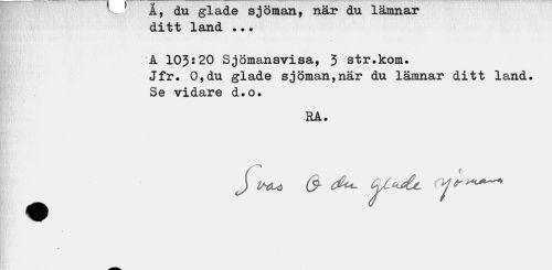 //// P v..,-' a, au gxaae sjuiaaji, xitix- au xauuiax //// ditt land ..• //// A 103:20 Sjömansvisa, 3 str.kom. //// Jfr. 0,du glade sjöman,när du lämnar ditt land. //// Se vidare d.o. //// RA. ////