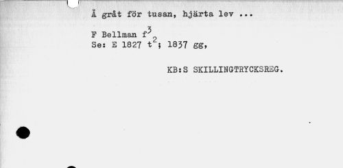 //// A gråt för tusan, hjärta lev ... //// 3 //// F Bellman fy //// Se: E 1827 t ; 1837 gg, //// KB: S SKILLINGrTRYCKSREG• ////