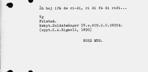 //// Åh hej ifä de ri-di, ri di fa di ridi... Vg //// Fristad. //// Mskpt.Soldatsånger IV.s.809.E.U.28204. (uppt.K.A.Rignell, 1890) //// NORD MUS. ////