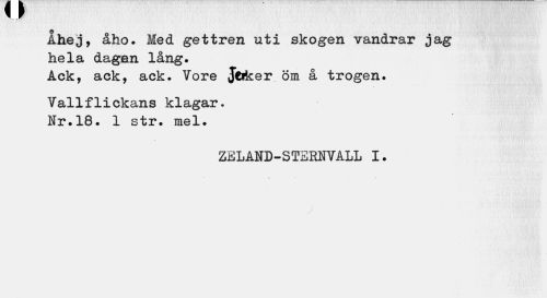 //// Åhej, åho. Med gettren uti skogen vandrar jag hela dagan lång. //// Ack, ack, ack. Vore Jerker öm å trogen. //// Vallflickans klagar. Nr.18. 1 str. mel. //// ZELÅND-STEENVÅLL I. ////