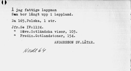 //// A jag fattige lappman //// Sam bor långt upp i Lappland. [ //// t //// Da l65jjPolska, 1 str. //// Jfr.Se IV:1124. //// " Säve.Gotländska visor, IO3. //// " Fredin.Gotlandstoner, 154. //// ANDERSSON SV.LÅTAR. //// I //// i //// f //// I ¦ //// l i ////
