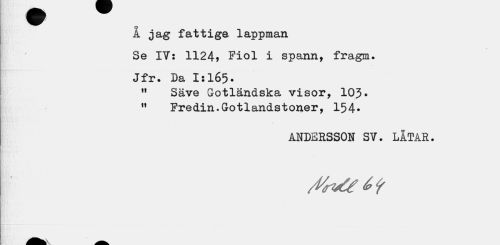 //// ^H B //// A jag fattige lappman //// Se IV: 1124, Fiol i spann, fragm. //// Jfr. Da I:I65. " Säve Gotländska visor, lOJ. " Fredin.Gotlandstoner, 154* //// ANDERSSON SV. LATAR. //// ^^ ' a. ////