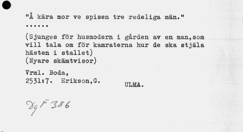 //// "A kära mor ve spisen tre redeliga män." //// (Sjunges för husmodern i gården av en man,som vill tala om för kamraterna hur de ska stjäla hästen i stallet) (Nyare skämtvisor) //// Vrml. Boda, //// 2531*7* Erikson,G. TTT,rA //// 1 ' ULMA. //// ^ / ////