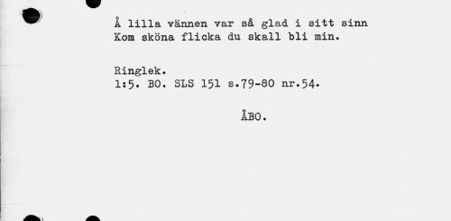 //// ^^ Å lilla vännen var så glad i sitt sinn //// Kom sköna flicka du skall bli min. //// Ringlek. //// 1:5. BO. SLS 151 s.79-80 nr.54. //// ABO. ////