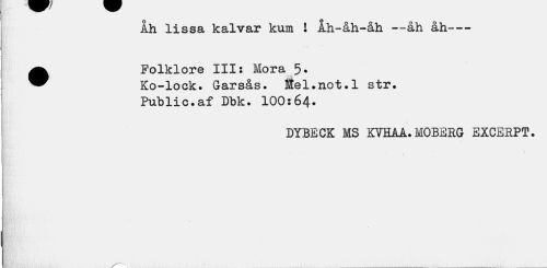 //// Ah lissa kalvar kum 1 ih -åh-åh —åh åh--- //// A Folklore III: Mora 5. //// ^^ Ko-lock. Garsås. Éel.not.l str. //// Public.af Dbk. 100:64. //// DYBECK MS KVHAA. MOBERG EXCERPT. //// y v ////