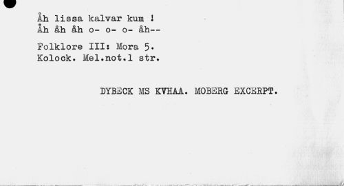 //// Ah lissa kalvar kum i //// o //// Ah åh åh o- o- o- åh— //// Folklore III: Mora 5* Kolock. Mel.not*1 str, //// DYBECK MS KVHAA. MOBERG EXCERPT. //// ^. .. •* . ___. mi ////