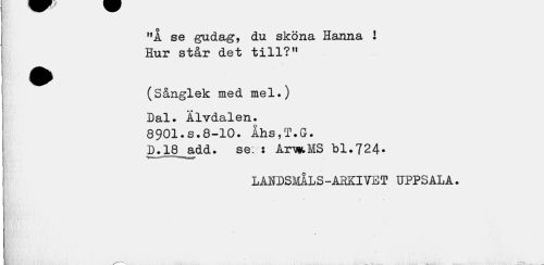 //// "i se gudag, du sköna Hanna I Hur står det till?" //// (Sånglek med mel.) //// Dal. Älvdalen. //// 8901.s.8-10. lhs,T.G. //// D.18_add. se. : Arv*MS bl.724- //// LANDSMÅLS-ARKIVET UPPSALA. //// ¦ //// » //// i ////