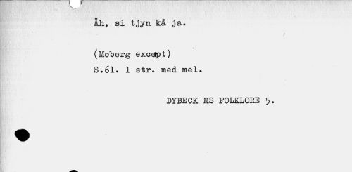 //// ,__.V //// Åh, si tjyn kå ja. //// (Moberg exceipt) S.61. 1 str. med mel. //// DYBECK MS FOLKLORE 5. //// » ////