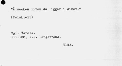 //// "i secken liten dä ligger i diket." //// . //// (Polsktext) Vgl. Varola. //// 111:180, s.2. Bergstrand. //// ULMA. ////