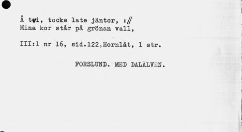 //// ^HP^-' 1 | //// i tyi, tocke late jäntor, :// Mina kor står på grönan vall, //// i //// t //// III si nr 16, sid.122,Hornlåt, 1 str. //// I i //// FORSLUND. MED DALÄLVEN. //// I l //// i //// £ //// l t //// f //// J i //// I < ////