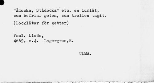 //// o //// "Ådocka, Stådocka" etc. en lurlåt, som befriar geten, som trollen tagit. //// (Locklåtar för getter) Vsml. Linde, //// 4669, s.4. Lagergren,E. //// ULMA. ////