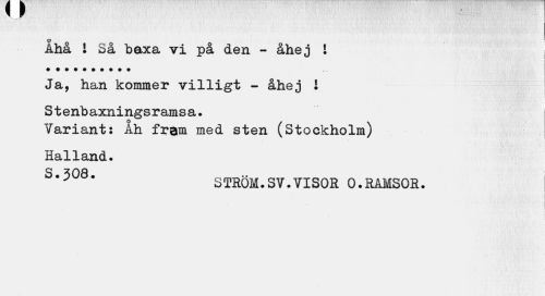 //// Åhå i Så baxa vi på den - åhej ! ; //// w i Ja, han kommer villigt - åhej 1 //// i-y* i //// Stenbaxningsramsa. //// Variant: Åh fram med sten (Stockholm) Halland. //// 3 # 5 08 # S TRÖM. SV. VISOR 0. RAMSOR. //// • i ////