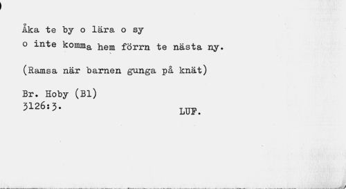 //// Aka te by o lära o sy o inte komma hem förrn te nästa ny. //// (Ramsa när barnen gunga på knät) Br. Hoby (Bl) //// 3126:3. lup> ////