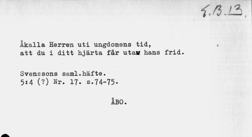 //// i, v.13, //// • . //// Åkalla Herren uti ungdomens tid, . //// att du i ditt hjärta får uta» hans frid. //// Svenssons saml.häfte. //// 5:4 (?) Nr. 17- s.74-75- //// ÅBO. ////