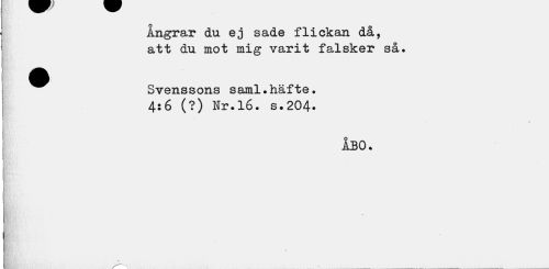 //// Ångrar du ej sade flickan då, att du mot mig varit falsker så. //// ^^ Svenssons saml.häfte. //// 4:6 (?) Nr.16. s.204. //// ÅBO. //// f V ////