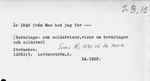 //// f- B, )$ //// * i //// i //// Ar 1840 från Moa hed jag for --- //// (Bevärings- och soldatvisor,visor om beväringar och soldater) //// 12062:5. Letterström,A. //// RA.INSP. //// I I ////