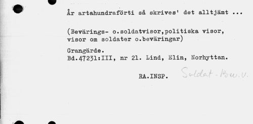 //// /J^^^Ba i //// ^^ Ir artahundraförti så skrives1 det alltjämt ... //// (Bevärings- o.soldatvisor,politiska visor, visor om soldater o.beväringar) //// Grangärde. //// Bd.47231:111, nr 21. Lind, Elin, Norhyttan. //// RA.INSP. • ////