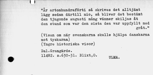//// »År artonhundraförti så skrives det alltjämt lägg sedan därtill nio, så bliver det bestämt den tjugonde augusti mång vänner skiljas åt den stund som var den sista den var uppfyllt med //// gråt." //// (Visan om när svenskarna skulle hjälpa danskarna //// mot tyskarna) //// (Yngre historiska visor) //// » //// Dal.Grangärde. //// 11482. s.630-31. Blixt,0. TTf.MA //// \ ////