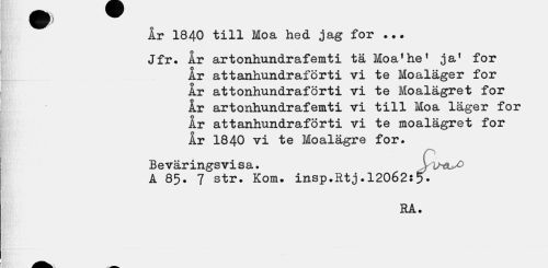 //// År 1840 till Moa hed jag for ... //// Jfr. År artonhundrafemti tä Moafhe! ja! for //// År attanhundraförti vi te Moaläger for //// Ar attonhundraförti vi te Moalägret for //// Ar artonhundrafemti vi till Moa läger for //// År attanhundraförti vi te moalägret for //// År 1840 vi te Moalägre for. //// B e vär ings vi s a. \ //// A 85. 7 str. Kom. insp.Rtj.12062:5* //// MV' vA.1 ,'4 //// RA. ////