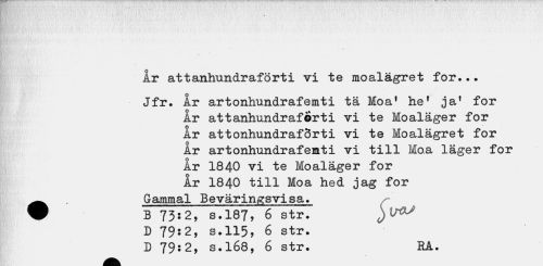 //// r //// Ar attanhundraförti vi te moalägret for... //// Jfr. Ar artonhundrafemti tä Moa1 hef ja! for Ar attanhundraförti vi te Moaläger for Ar attonhundraförti vi te Moalägret for Ir artonhundrafemti vi till Moa läger for Ar 1840 vi te Moaläger for Ir 1840 till Moa hed jag for ^^ Gammal Bevärin&svisa. //// W B 73:2, s.187, 6 str. j W //// D 79:2, s.115, 6 str. D 79:2, s.168, 6 str. RA. ////