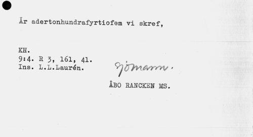 //// v //// Ar adertonhundrafyrtiofem vi skref, //// KH. //// 9:4. R 3, 161, 41. , //// Ins. L.L.Laurén. y(J"}y\[fry*?!/ < //// ÅBO RANCKEN MS. //// ... I //// ¦ - — — —- - — l //// * 1 ' I //// i //// * i ////