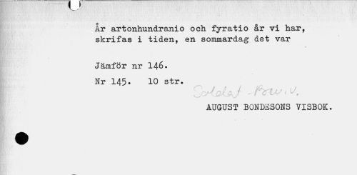 //// Ar artonhundranio och fyratio år vi har, skrifas i tiden, en sommardag det var //// Jämför nr 146. //// Nr 145- 10 str. //// r. ' / 1 /«V)« , , i / //// * ..Q'<JKj" ' * £ 1 ' //// AUGUST BONDESONS VISBOK. ////