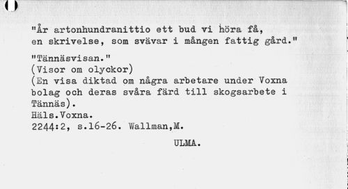 //// V". .1 -T //// ... . . , . . . - .. . . . . //// f,År artonhundranittio ett bud vi höra få, //// en skrivelse, som svävar i mången fattig gård." ? //// J. //// "Tännäsvi san." (Visor om olyckor) //// (En visa diktad om några arbetare under Voxna bolag och deras svåra färd till skogsarbete i j //// Tännäs). Hals.Voxna. //// 2244:2, s.16-26. Wallman,M. //// i //// ULMA. ; //// l //// i //// i P ////