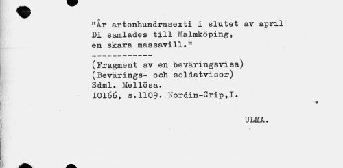 //// »År artonhundrasexti i slutet av april Di samlades till Malmköping, en skara massavill." //// (Fragment av en beväringsvisa) (Bevärings- och soldatvisor) Sdml. Mellösa. //// 10166, s.1109. Nordin-Grip,I. //// * //// ULMA. //// . 9 //// Jr _ ////