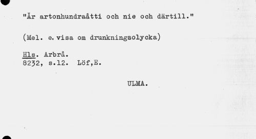 //// "År artonhundraåtti och nie och därtill." //// (Mel. e. visa om drunkningsolycka) //// Els. Arbrå. 8232, s.12. Löf,E. //// ULMA. ////