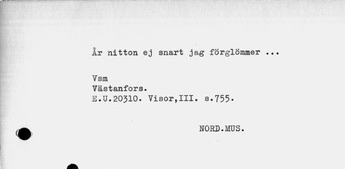//// År nitton ej snart jag förglömmer ... Vsm //// Västanfors. //// E.U.20310. Visor,III. s.755. //// 4 //// ^ NORD. MUS. ////