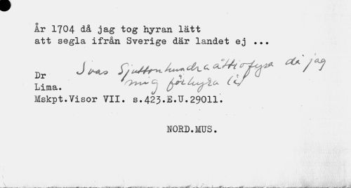 //// År 1704 då jag tog hyran lätt //// att segla ifrån Sverige där landet ej ••. //// Lima. (ft^c A/ //// Mskpt.Visor VII. s.423.E.U.29011. //// WORD.MUS. ////
