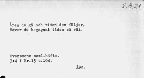 //// \ //// , • . i //// 5 //// i //// 4 //// i //// i //// Aren de gå och tiden den följer, //// Haver du begagnat tiden så väl. //// • \ //// Svenssons saml.häfte. //// 3:4 ? Nr.13 S.104. //// ÅBO. ////