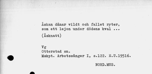 //// Åskan dånar vildt och fallet ryter, som ett lejon under dödens kval ... //// (Åsknatt) Vg //// Otterstad sn. //// ^^ Mskpt. Arbetssånger I, s.122. B.U.19516. //// NORD.MUS. ////