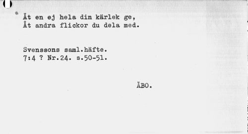 //// r //// I u //// Ät en ej hela din kärlek ge, //// At andra flickor du dela med. ! //// a //// . - //// Svenssons saml.häfte. //// 7:4 ? Nr.24. s.50-51. //// ÅBO. //// r i //// I l //// s i ////