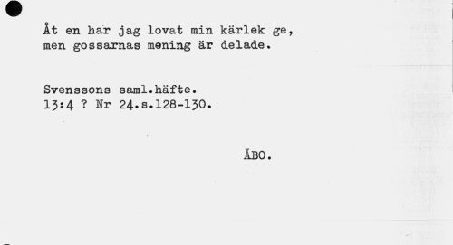 //// Åt en har jag lovat min kärlek ge, men gossarnas mening är delade» //// Svenssons saml.häfte. 13:4 ? Nr 24.s.128-130. //// ÅBO. ////