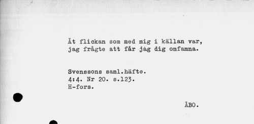 //// % //// Åt flickan som med mig i källan var, jag frågte att får jag dig omfamna. //// Svenssons saml.häfte. 4:4. Hr 20. s.123. H-fors. //// ^ ÅBO. ////