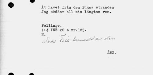 //// ^ Åt havet från den lugna stranden //// Jag skådar all min längtan ren. //// Pellinge. //// 1:4 INE 28 b nr.185-N. //// ÅBO. ////