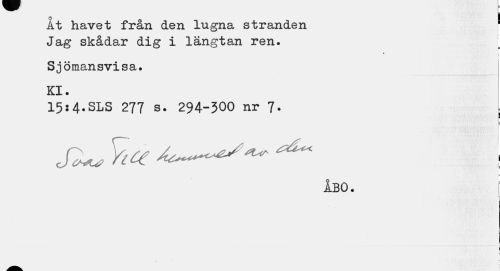 //// » o I //// At havet fran den lugna stranden 1 //// Jag skådar dig i längtan ren. //// * //// Sjömansvisa. Kl. //// 15s4-SLS 277 s. 294-300 nr 7- . //// i- //// ÅBO. //// | //// I //// ? //// i- ////