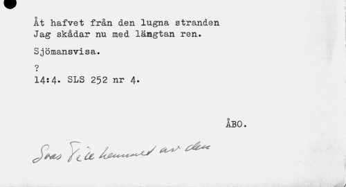 //// Åt //// hafvet från den lugna stranden Jag skådar nu med längtan ren. //// Sjömansvisa. //// 9 //// m //// 14:4. SLS 252 nr 4. //// ÅBO. //// / ////