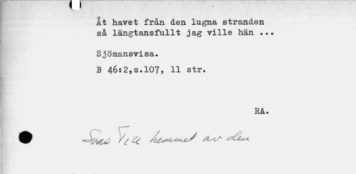 //// 7 //// Åt havet från den lugna stranden så längtansfullt jag ville hän ••• //// Sjömansvisa. //// i //// B 46:2,s.107, 11 str. //// RA. ////