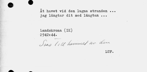 //// ¦ B //// —T //// o //// At havet vid den lugna stranden ••• jag längtar dit med längtan //// t //// Landskrona (IK) //// 2942:44- //// m ' r— //// LUF. //// (f y, ' //// • .1 ////