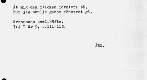 //// Åt mig den flickan förklara så, hur jag skulle genom fönstret gå. //// Svenssons saml.häfte. 7:4 ? Nr 9, s.111-112. //// ÅBO. //// r //// • k k , ; | • ////
