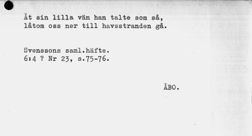 //// Åt sin lilla vän han talte som så. låtom oss ner till havsstranden gå. //// Svenssons saml.häfte. //// 6:4 ? Nr 23, s.75-76. //// ÅBO. ////