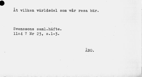 //// w //// ~ I //// o //// At vilken världsdel som vår resa bär. //// Svenssons saml.häfte. 11:4 ? Nr 23, s.l-3. //// ÅBO. //// t //// I //// I ////