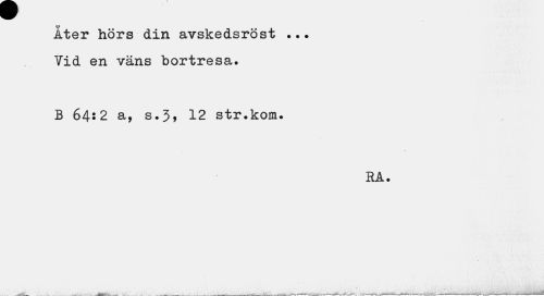 //// ? //// Ater hörs din avskedsröst ... Vid en väns bortresa. //// B 64:2 a, s.J, 12 str.kom. //// RA. ////