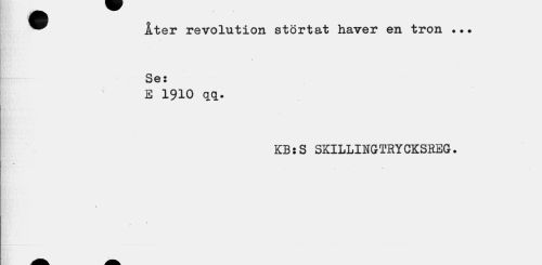 //// ^^ Åter revolution störtat haver en tron //// Se: //// E 1910 q.q. //// KB:S SKILLINGTRYCKSREG. //// » ////