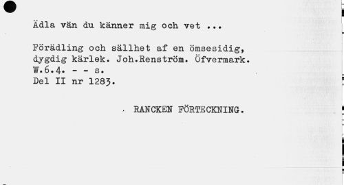 //// w i //// Ädla vän du känner mig och vet •. • //// Förädling och sällhet af en ömsesidig, dygdig kärlek. Joh.Renström, öfvermark. //// W.6.4. - - s. I //// Del II nr 1283. ! //// ntf,-' i t //// ¦ RANCKEN FÖRTECKNING. \ //// u //// I //// 1 //// I ¦ //// E ////